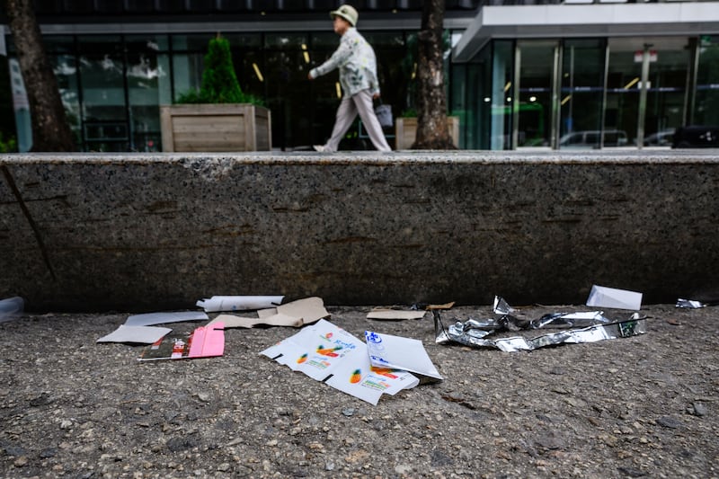 2024년 7월 24일, 서울에서 한 행인이 북한에서 보낸 오물 풍선으로 추정되는 북한 식품 포장재와 과자 포장지, 종이 조각이 떨어진 인도를 걷고 있다. / AFP (ANTHONY WALLACE/AFP)