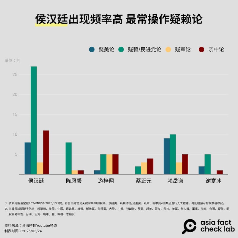 资料比对结果显示,《宝岛,报到! 》在2024年10月至2025年1月这段时间内,最常发表“三疑”言论的台湾名嘴为:侯汉廷、游梓翔、蔡正元、谢寒冰、赖岳谦以及陈凤馨。