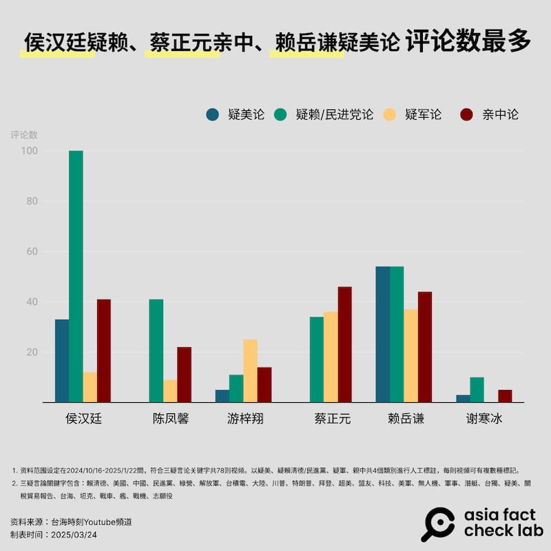 注:AFCL归纳的“三疑”言论关键字包括:赖清德、美国、中国、民进党、绿营、解放军、台积电、大陆、川普、特朗普、拜登、超美、盟友、科技、美军、无人机、军事、潜艇、台独、疑美、关税贸易报告、台海、坦克、战车、舰、战机、志愿役。